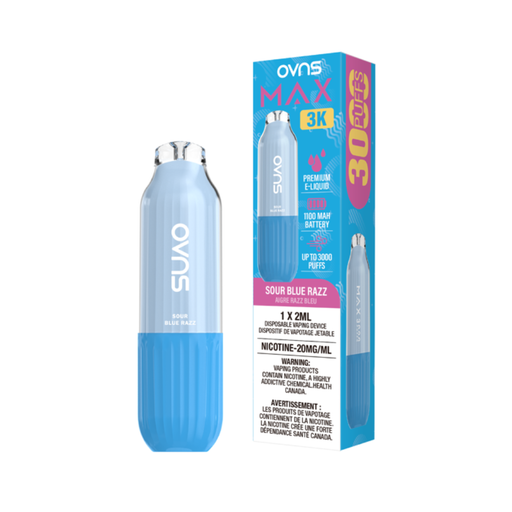 OVNS Max 3K β Sour Blue Razz Disposable Vape | 20mg | 20ml OVNS Max 3K β Sour Blue Razz delivers a tangy explosion of sour blue raspberry candy wit...